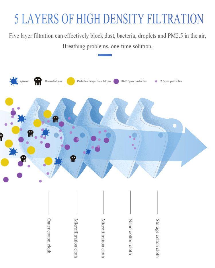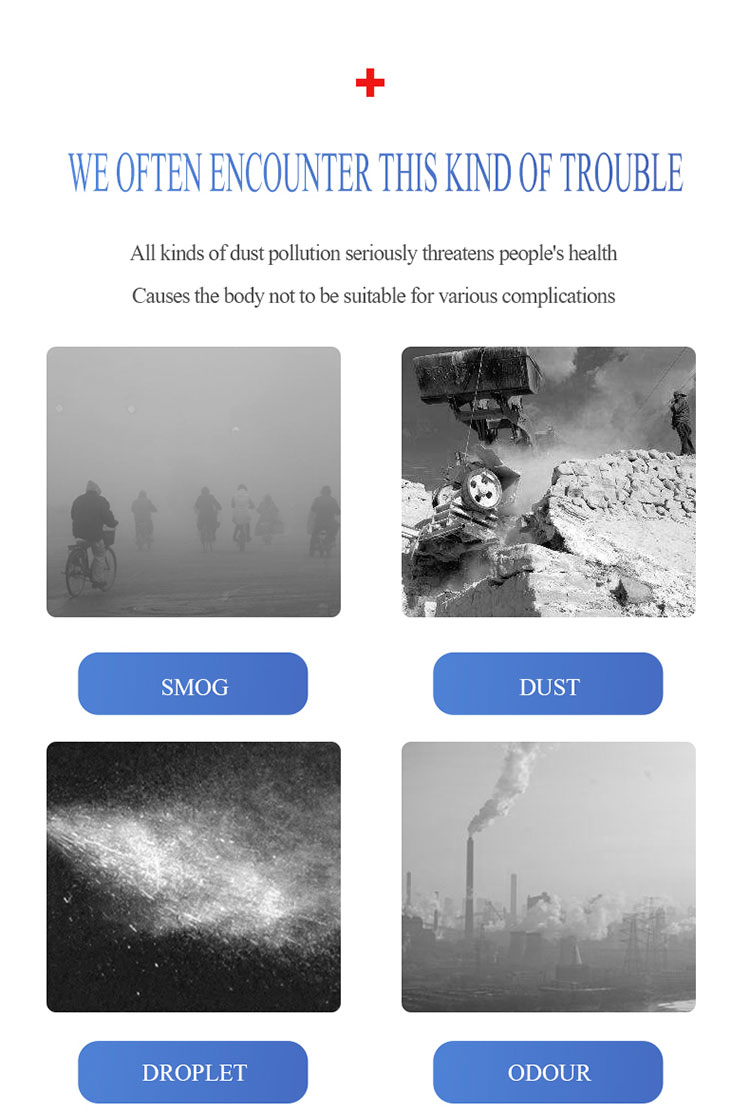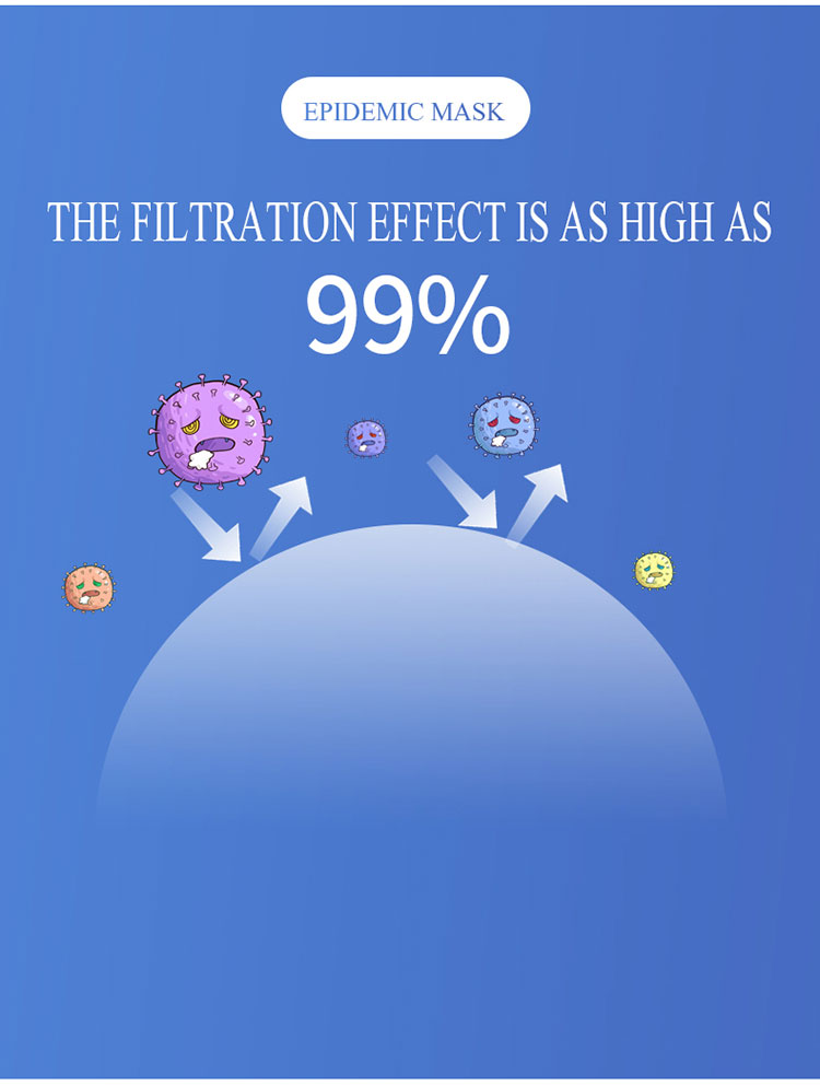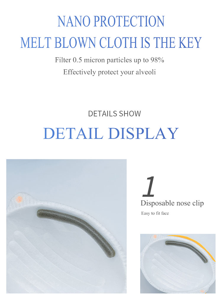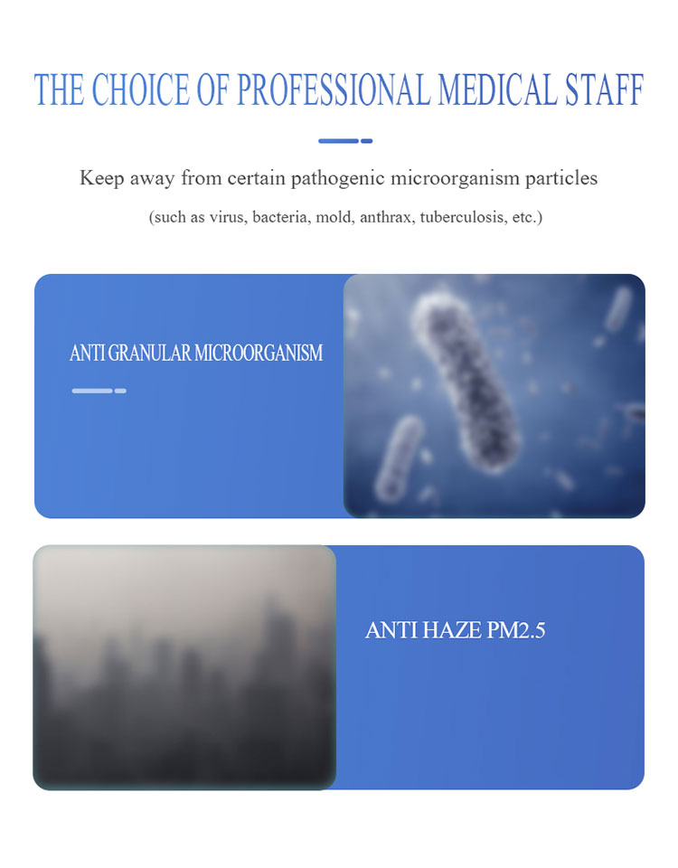 ၃။ စစ်ထုတ်သည့်အဆင့်သည် FFP2 ဖြစ်ပြီး၊ အသက်ရှူမှုဒဏ်ကိုထိရောက်စွာကာကွယ်နိုင်ပြီးသုံးစွဲသူအားအနိမ့်ဆုံးနှင့်အသက်သာဆုံးအသက်ရှူမှုကိုအကောင်းဆုံးဖုန်မှုန့်ခံနိုင်သည့်သက်ရောက်မှုအောက်တွင်ထားရှိနိုင်သည်။