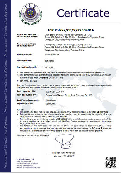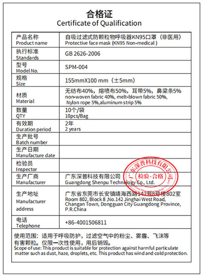 N95 အကာအကွယ်မျက်နှာဖုံး (ခေါက်)-Certificate of Qualification